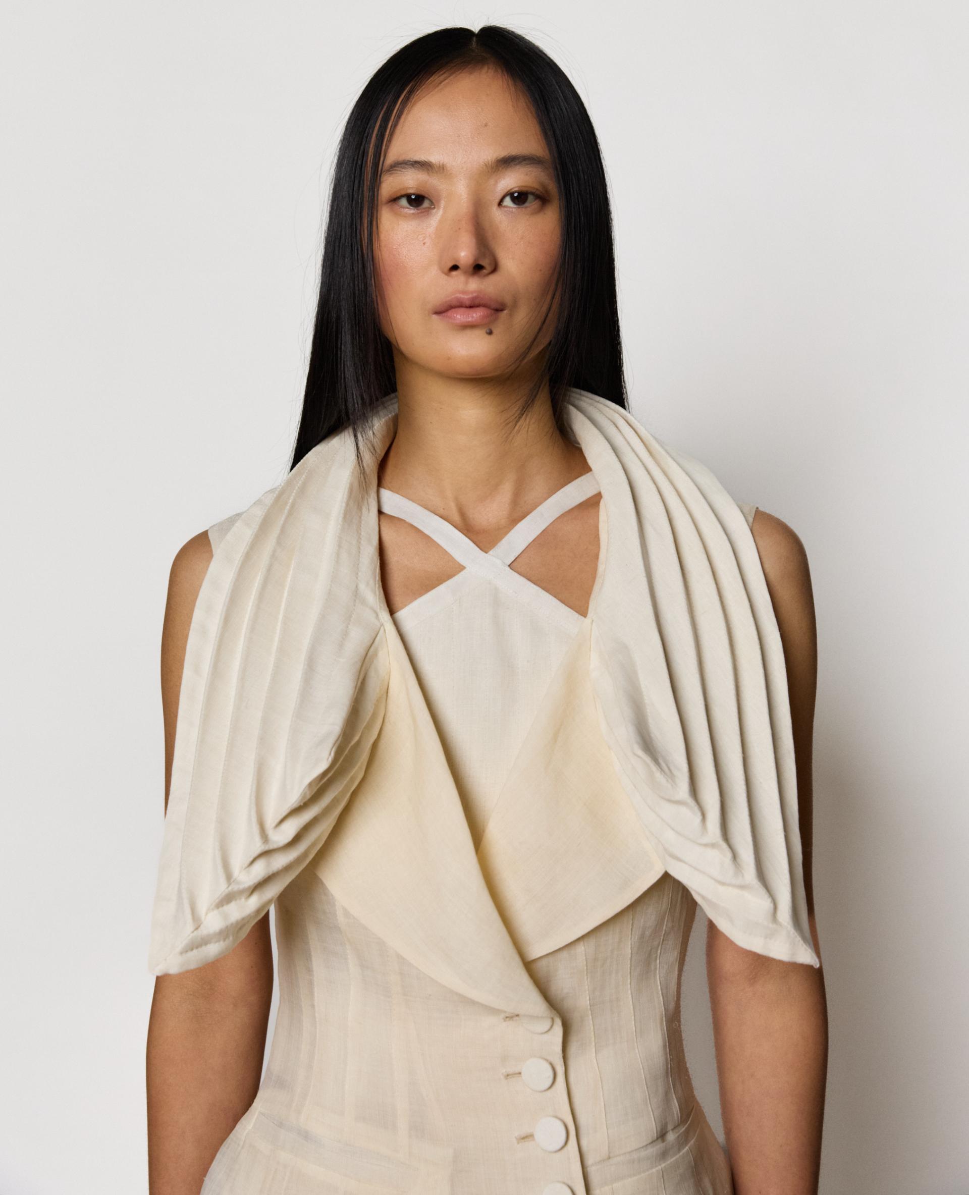 | JULYCOLUMN continues to skillfully integrate Korean history into fashion. This collection explores the interconnectedness of historic and modern Korea. Using inspiration from “Seonbi;” a term referring to a scholar who embodies the Confucianism ideology and the traditional menswear worn by these scholars, which use skillful traditional pattern cutting methods. Beading craftsmanship has been applied specifically inspired by the use of Jade, which since ancient times has symbolized nobility. Crafts and clothing are apart of Korean history, this collection further delves into the significance of tradition in modern lives, both literally and metaphorically. |