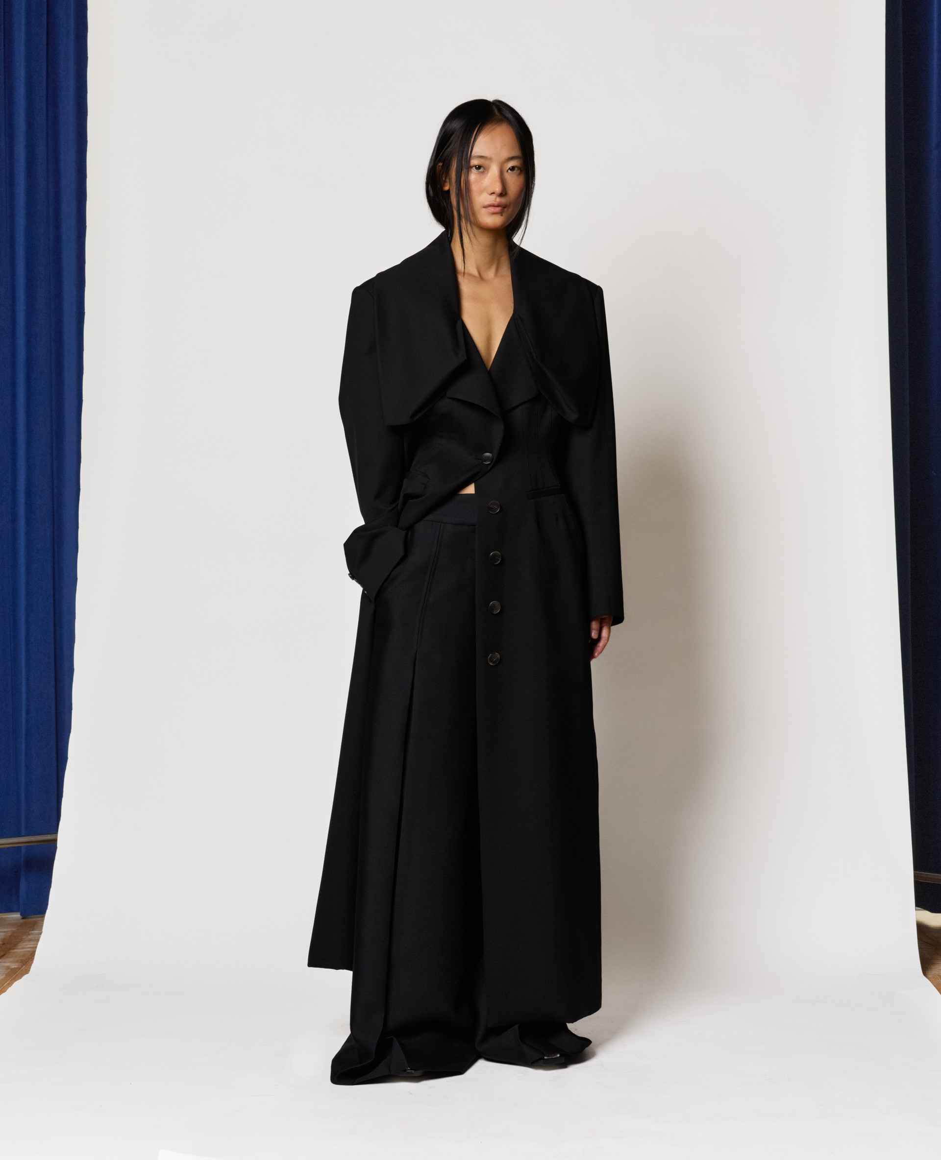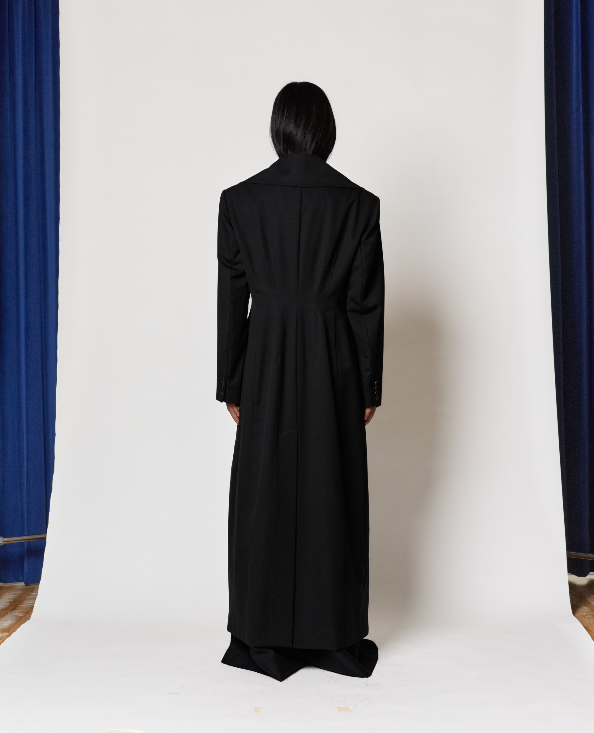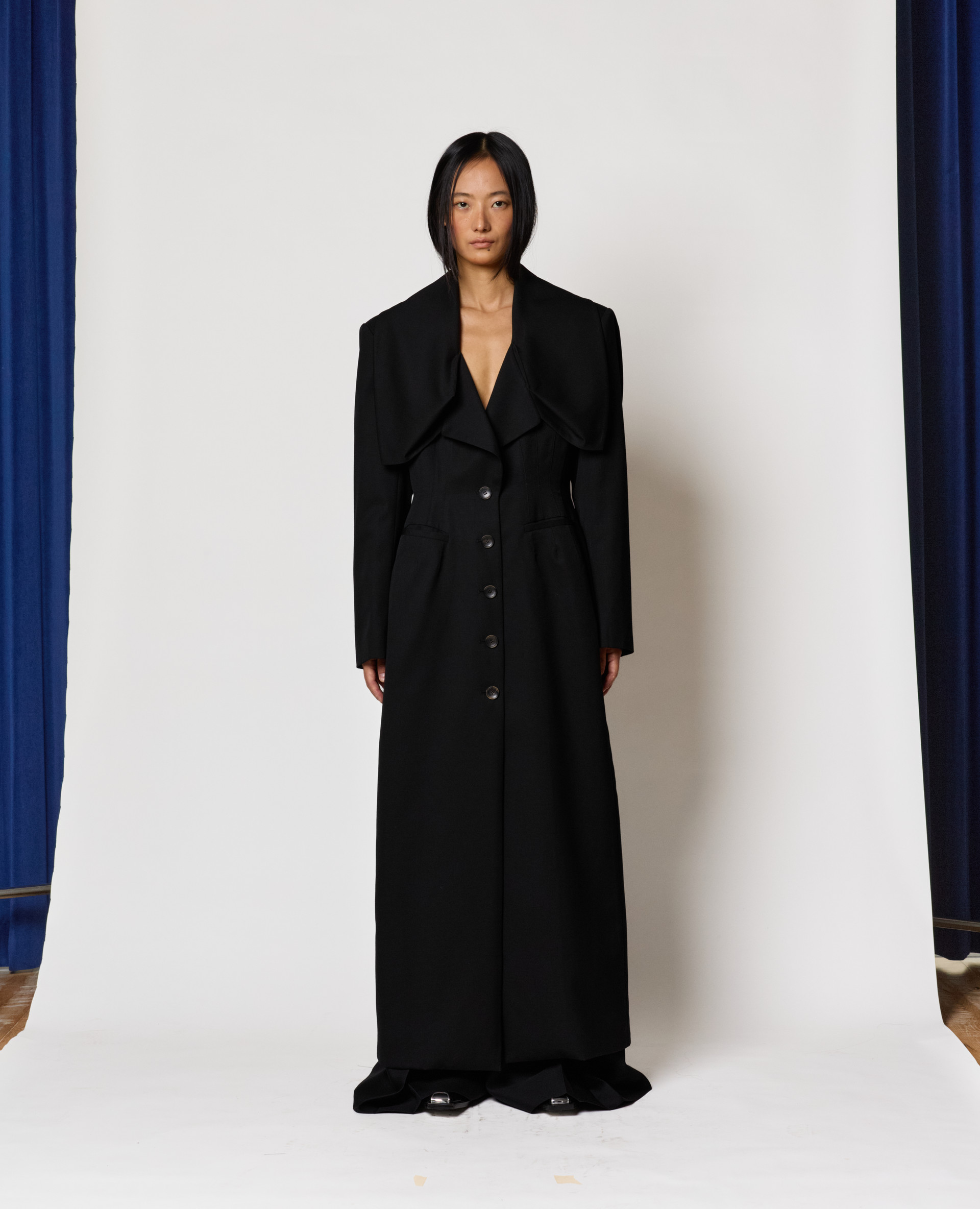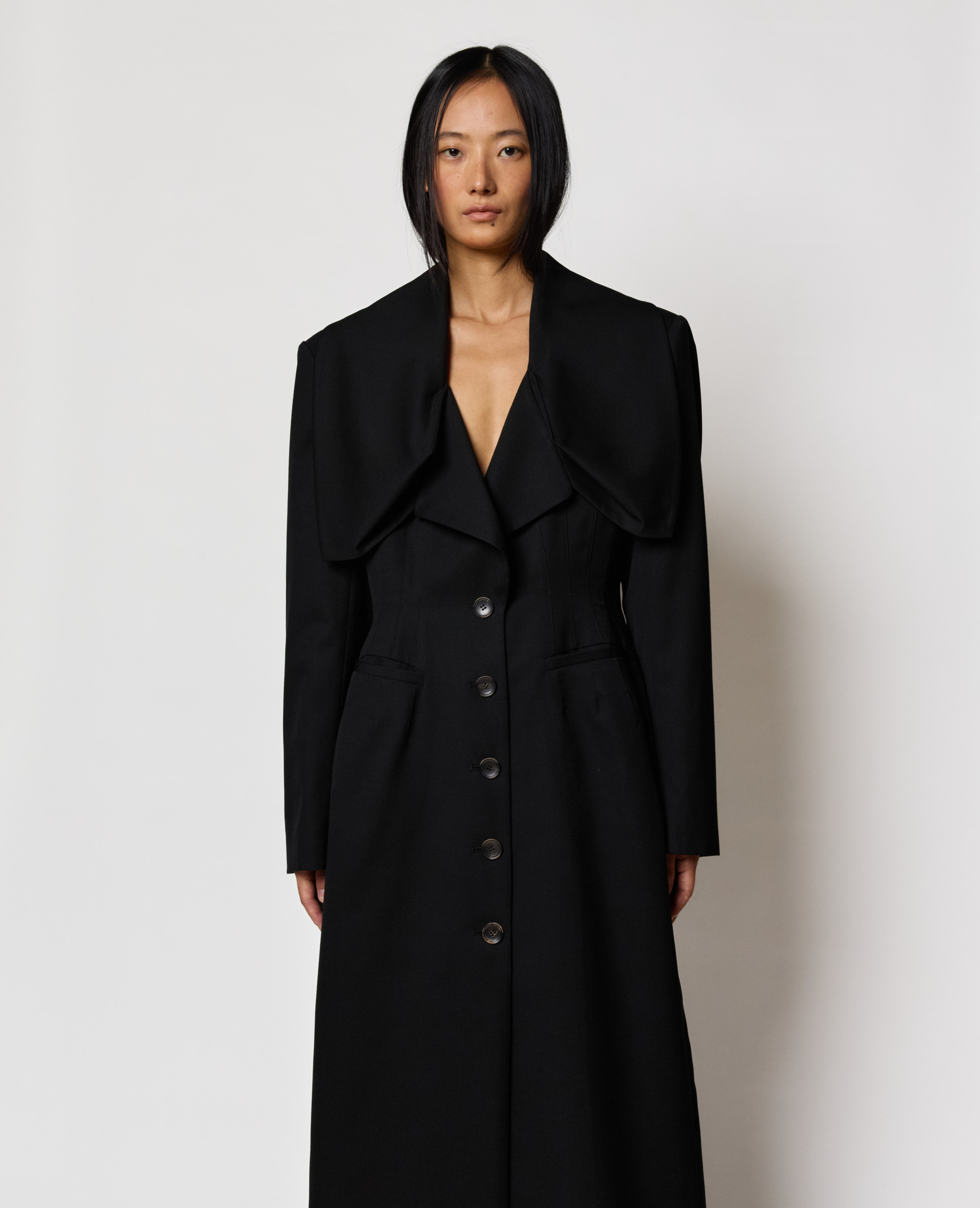 • Description: Tailored wool silk blend coat with Kiwa-inspired collar, shoulder pads, fitted waist, flared fit, waist dart detail, horn button fastening