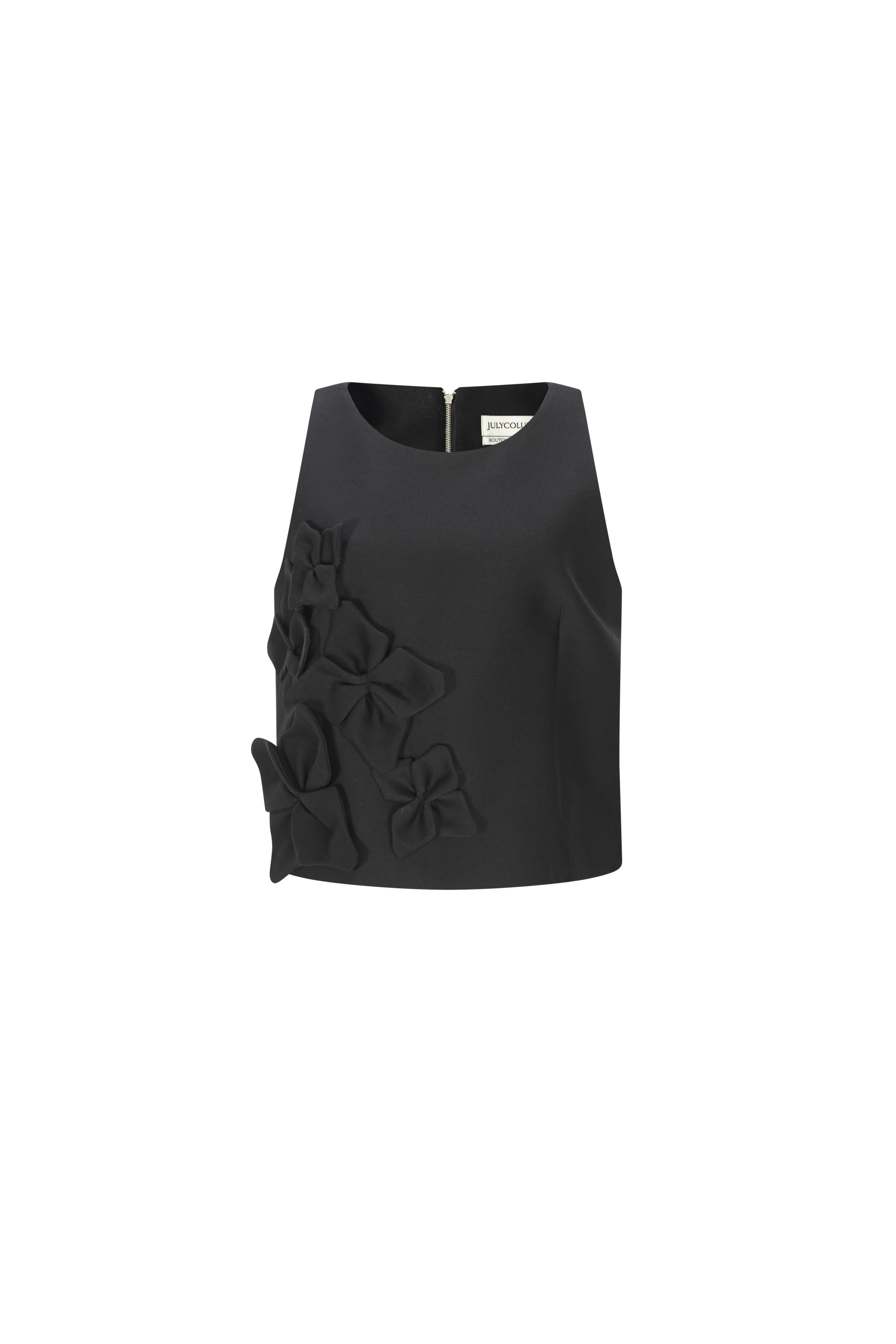 •Description: Wool silk blend hand smocked sleeveless top. round neck, Silver back zip closure, Signature flower detail decoration