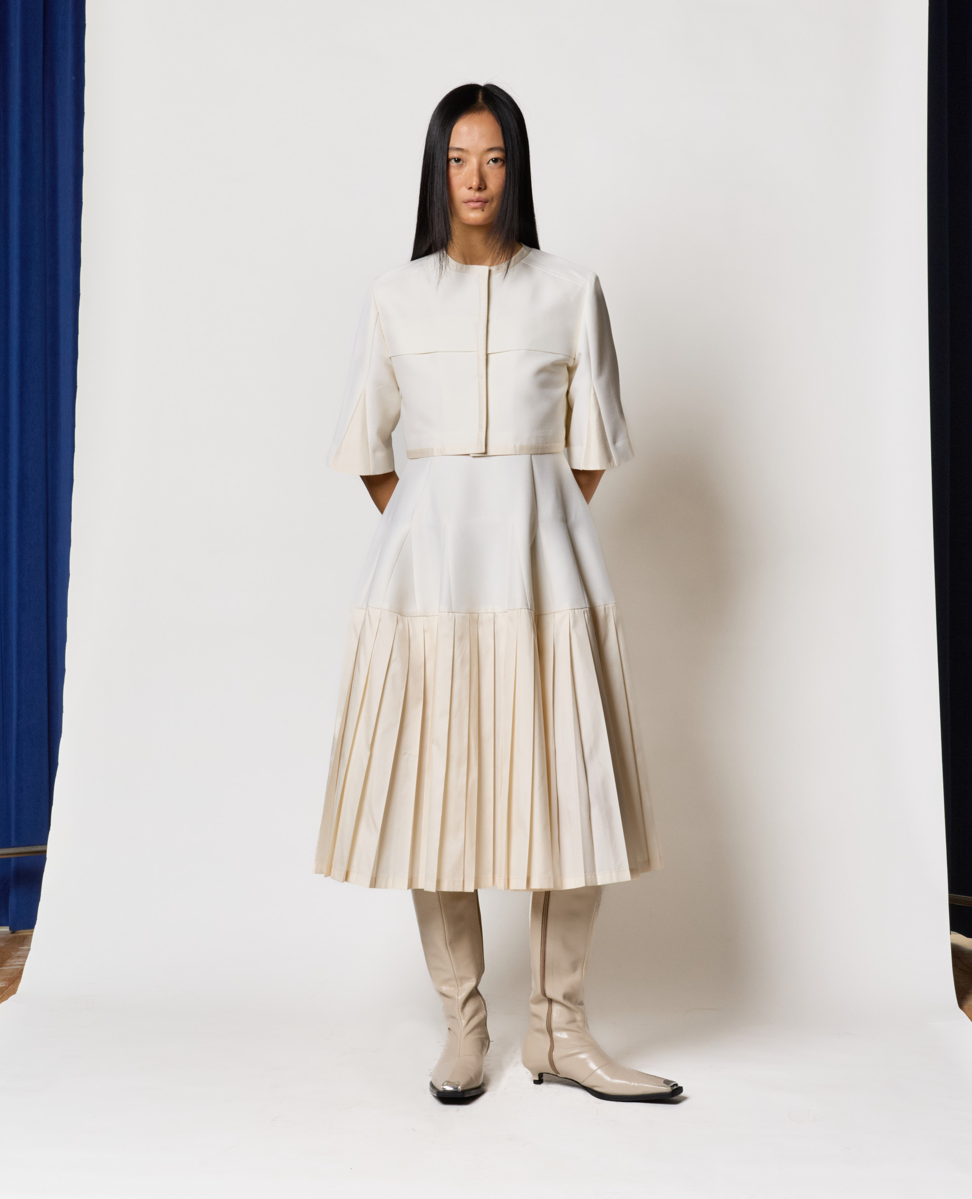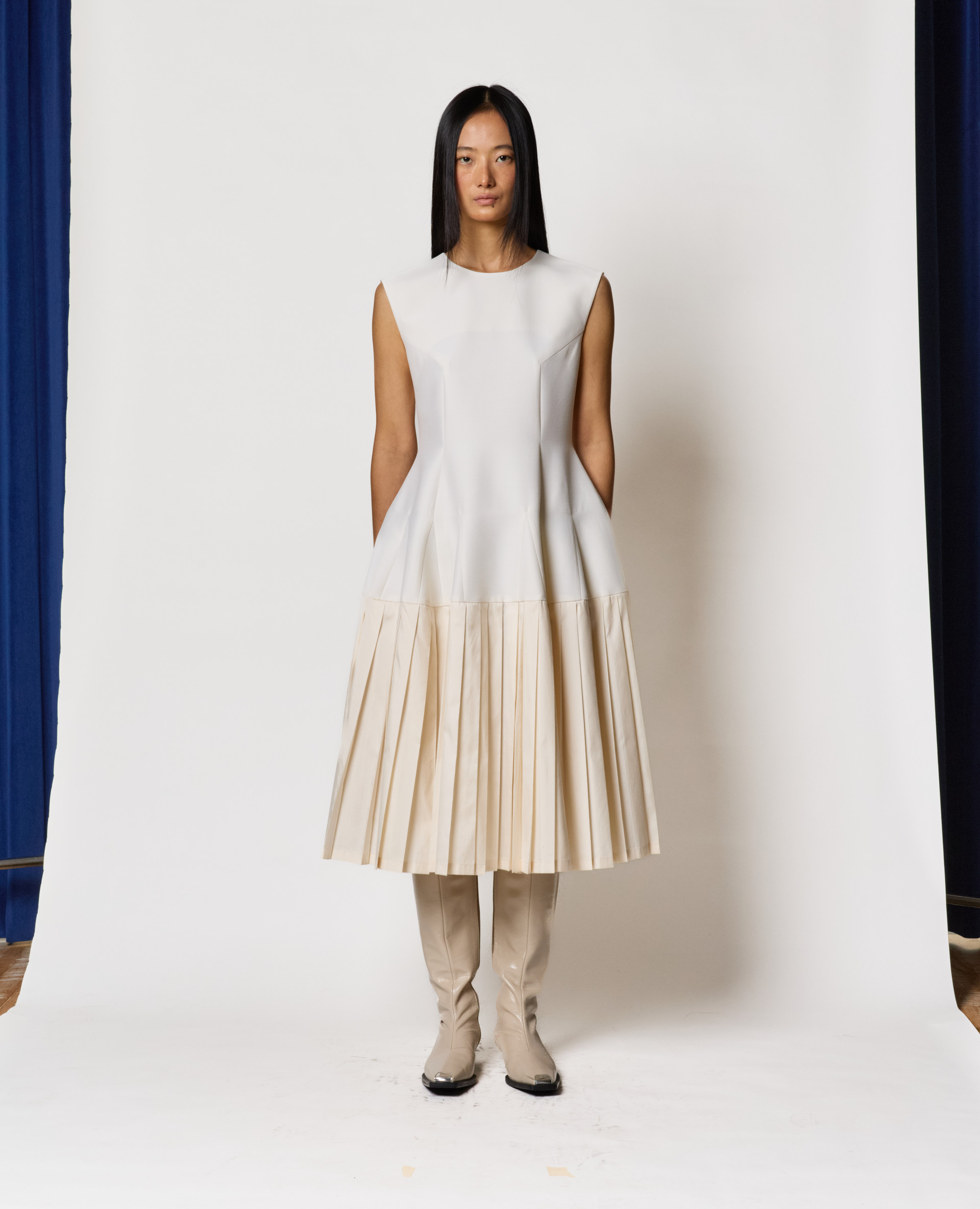• Description: Wool silk blend, Pleated midi dress, Fitted waist, Flared fit, Triangle panel detail, Signature hem pleats, Silver back zip closure